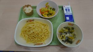 今日の給食には「下仁田ネギのオイルパスタ」が出ました。「下仁田ネギのオイルパスタ」はブロッコリーにオイルがからまっていて美味しかったです。