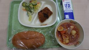 今日の給食には、冬野菜のミネストローネと白身魚のフライが出ました。白身魚のフライは骨がなくて食べやすかったです。