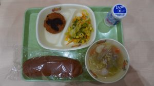 今日はパンとハムカツとコーンサラダとABCマカロニスープでした。特にハムカツはサクサクしていて美味しかったです。