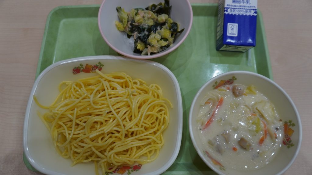 今日の給食には、「チキンと春キャベツのクリームパスタ」が出ました。「チキンと春キャベツのクリームパスタ」はクリーミィでとても美味しかったです。