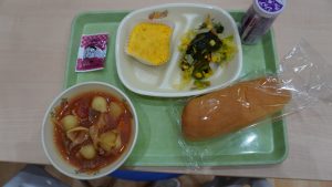 今日の給食には「ビビンバ」と「ゼリーケーキ」が出ました。「ゼリーケーキ」は下仁田小学校の図書委員会とのコラボ給食だそうです。とても美味しかったです。