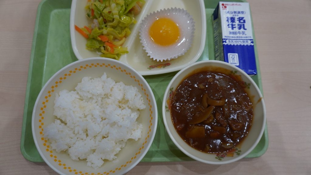 今日の給食には「こんさいのハッシュドポーク」が出ました。安定の美味しさでした。
