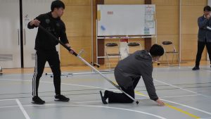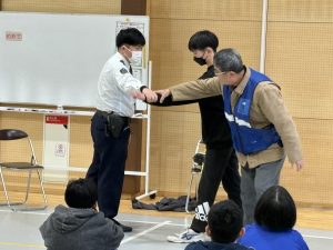 1月19日(月) 富岡警察署スクールサポーターの青木様、砥沢駐在所長の柳井様を講師にお招きし、不審者対応避難訓練を行いました。今回は特に、教職員の目が行き届きにくい「登下校時」の安全確保に重点を置いてご指導いただきました。青木様からは、知らない人に声をかけられた時の鉄則として合言葉「いかのおすし」を再確認していただきました。【いか:行かない の:乗らない お:大声を出す す:すぐ逃げる し:知らせる】特に、不審者との距離の取り方について、実際に実演を通して分かりやすく教えていただきました。また、もしもの時の「護身術」体験として、万が一、腕を掴まれたり後ろから抱きつかれたりした時に、相手を振り切って逃げるための簡単な護身も実演を通して教えていただきました。子どもたちは「力の強さではなく、体の使い方で逃げられる」という具体的な方法を真剣に聞くことができました。
