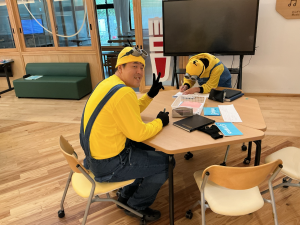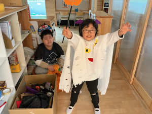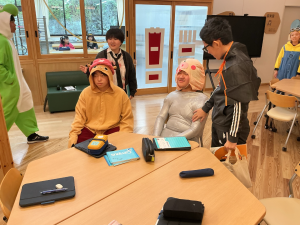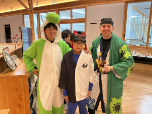 10月31日(金) 魔法使い🧙♀️や魔女、可愛らしい動物、人気アニメのキャラクターまで…子供も大人も皆が思い思いの仮装で、個性豊かに大変身しました。 教室や廊下は、まるで外国の街角のような、活気あふれるハロウィンの雰囲気に包まれました。互いの仮装を見せ合ったり、「What are you?」「I’m a…」と英語で質問し合ったりする姿も見られ、自然な形でコミュニケーションが生まれていました。
