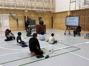 12月18日(木) 書き初め講師の横尾先生をお招きし、書き初め練習会を実施しました。体育館に集まった子供たちは、いつもとは違う大きな紙と太い筆に少し緊張した面持ちでしたが、横尾先生から筆の運びや文字のバランスについて丁寧なご指導をいただくと、集中して筆を動かし始めました。