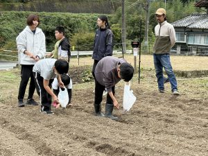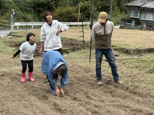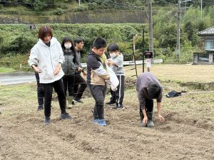 10月24日(金) 授業の最初では、農家の五十嵐さんから小麦の種もみについての説明を受け、実際に手に取ってその様子をじっくりと観察しました。小さな一粒の種もみが、どのようにして大きな穂となり、私たちの食卓を支える小麦になるのか。前期課程の児童は、命の始まりとなる種もみの重さや形、色などを確かめることができました。五十嵐さんからは、種を蒔く深さや間隔、土のかけ方など、麦の生育を左右する重要なポイントについて、丁寧にご指導いただきました。その後、児童は畝(うね)に向かい、教わった通りに慎重に種を蒔いていきました。慣れない作業に戸惑いながらも、未来の小麦を想像しながら、一粒一粒に心を込めて土をかけている姿が印象的でした。
