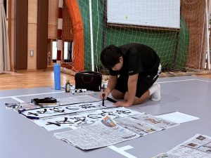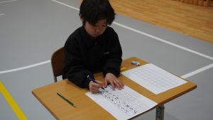1月7日(水) 冬休み中の練習の成果を発揮しようと、会場となったアリーナは、心地よい緊張感に包まれました。ピンと張り詰めた空気の中、子どもたちは一筆一筆に集中し、真剣な表情で取り組むことができました。1年生は硬筆、3年生から9年生は毛筆に取り組み、どの子も力強く、伸びやかな文字を書き上げていました。完成した作品からは、新しい一年への期待や目標が伝わってくるようです。